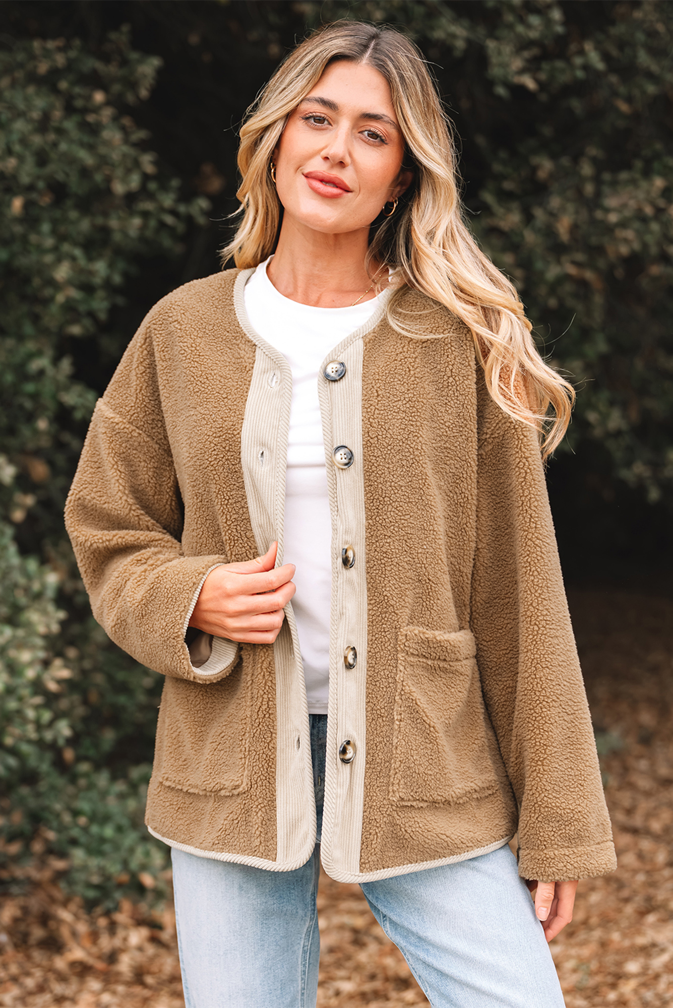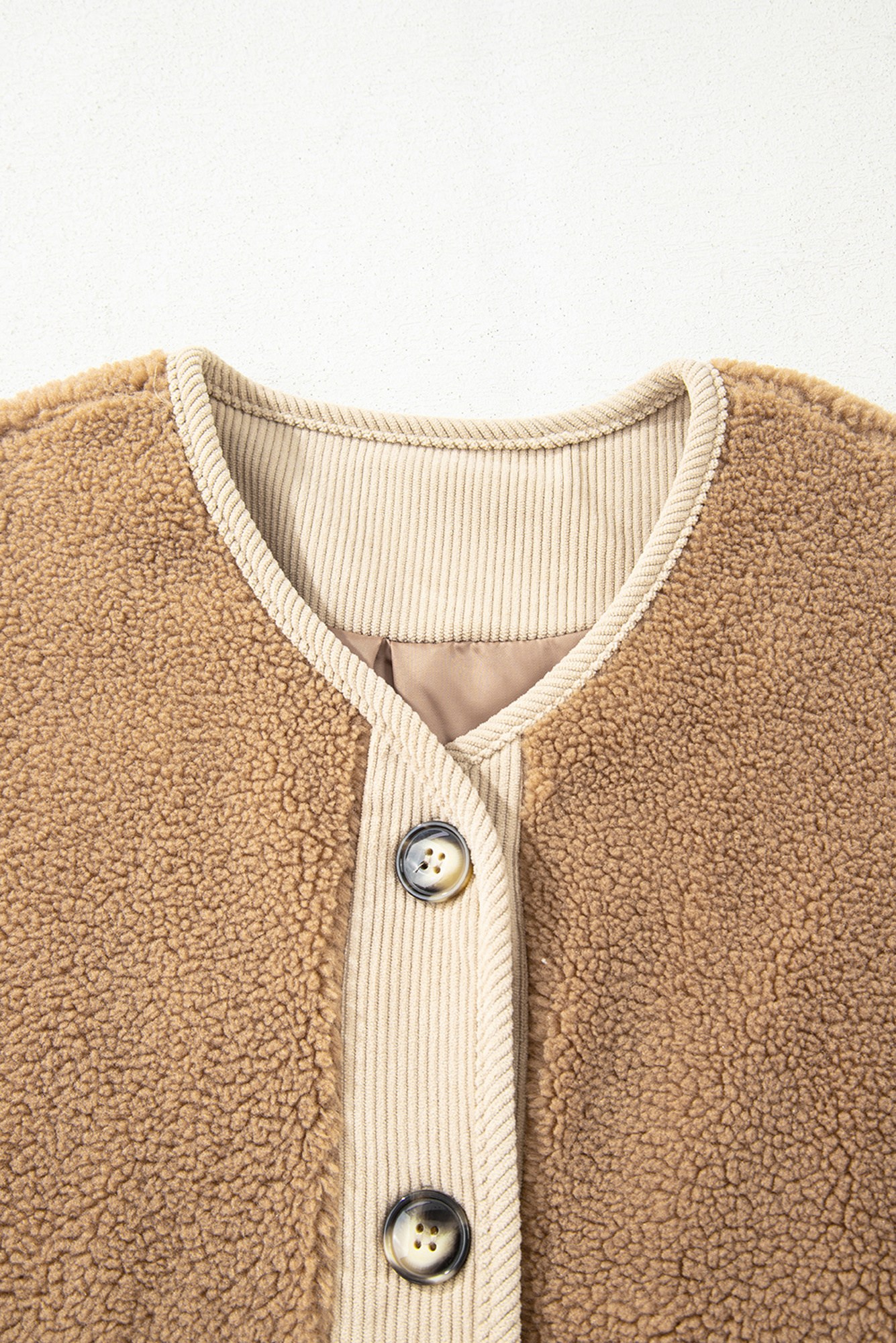 Meet Lilisha Corduroy Edge Patchwork Jacket—effortless, flattering, and easy to style for everyday life. This plush jacket is thick and warm for cold winter. It features an oversized puffy silhouette which is suitable for most. The corduroy edge detail adds extra retro fashion charm. This sherpa jacket is stylish and functional with big pockets. Womens sherpa jackets from Dear-Lover jackets collection. Material: 100%Polyester.