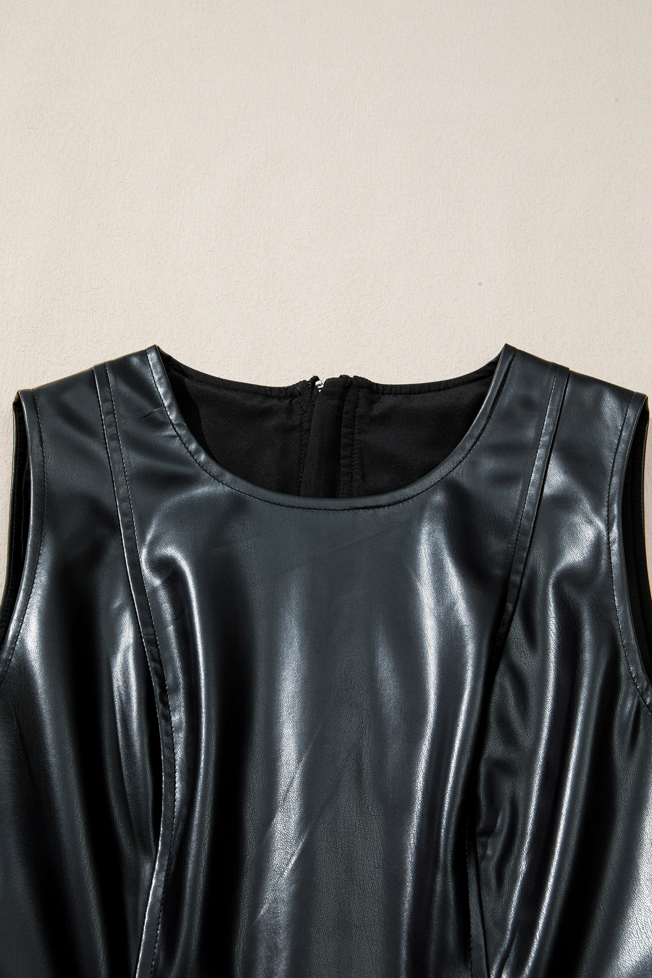 Reach for Lillian Hem Sleeveless Mini Dress whenever you want comfort, confidence, and simple styling. Faux leather material adds edgy, sleek style. Ruffle hem provides a playful, feminine touch. Sleeveless design allows easy layering or solo wear. Mini length creates a bold, modern silhouette. Material: 100%PU.