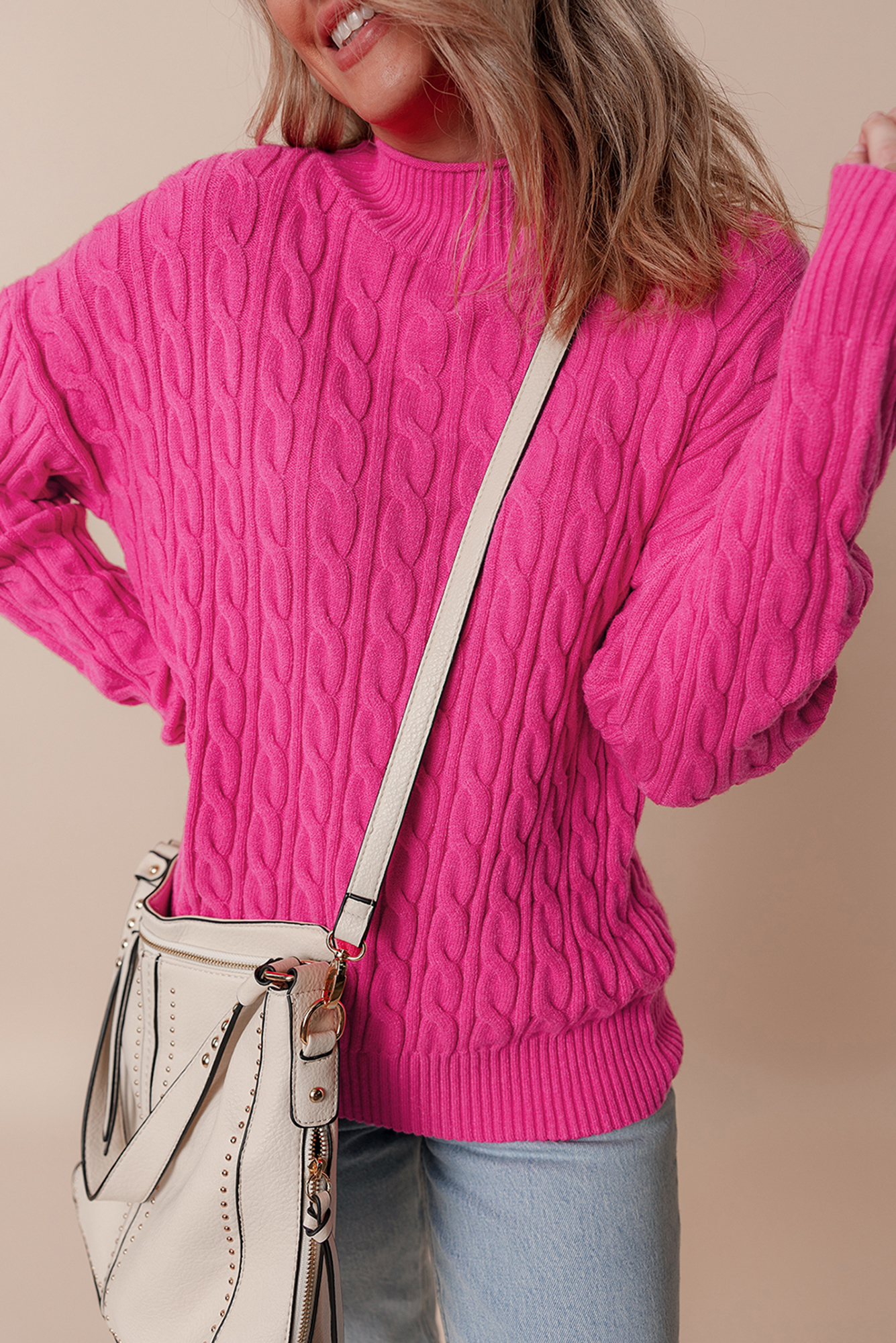 Lola High Drop Shoulder Sweater keeps things simple: cozy, flattering, and ready for wherever the day takes you. The plain offers a cozy and elegant option for cooler weather. The high neck provides extra warmth and a sophisticated look. Cable knit detailing adds texture and a traditional touch to this timeless piece. The dropped shoulders give a relaxed and modern silhouette. Material: 50%Viscose+28%Polyester+22%Polyamide.