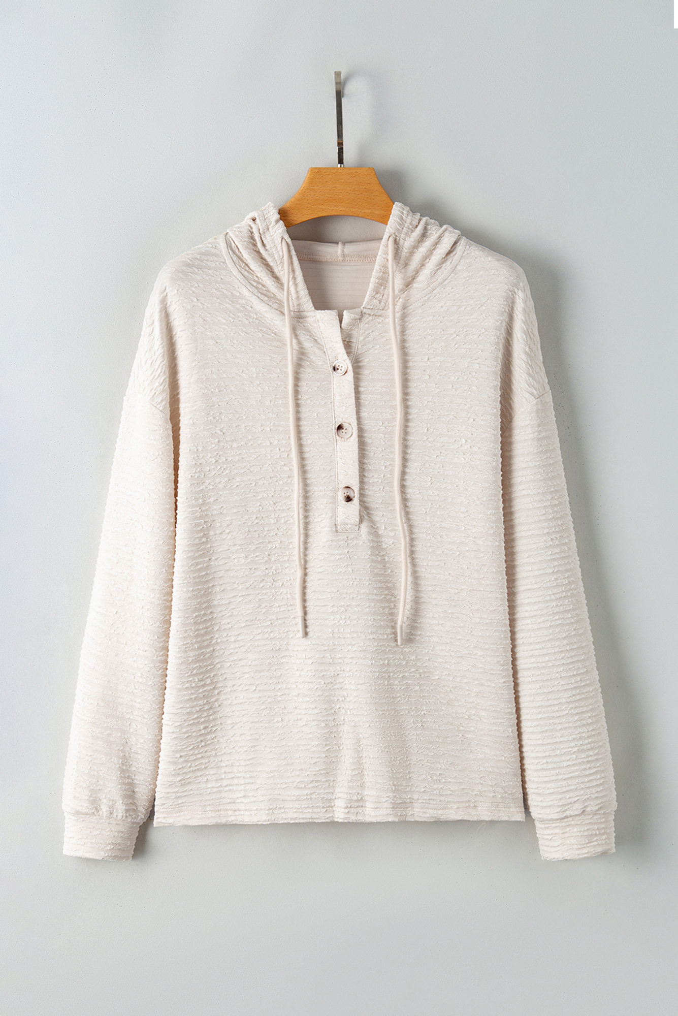 Meet Madison Textured Drawstring Henley Hoodie—effortless, flattering, and easy to style for everyday life. A soft lightweight hoodie for the new season Combines the trendy color with delicate textures Drawstring hood and buttoned split neckline Made of quality fabric with high stretch hoodies for women Material: 95%Polyester+5%Elastane.