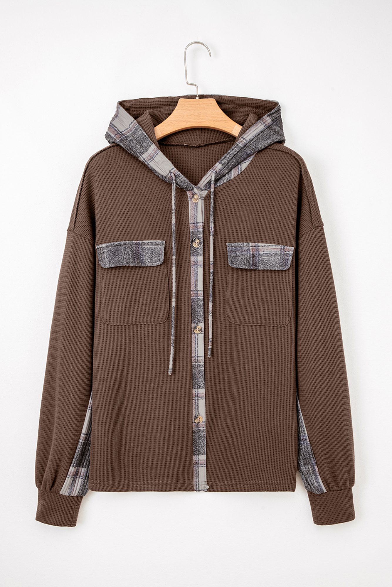 Marceline Down Drawstring Hooded Shacket is the piece you'll reach for when you want to look put together in seconds. This knit shacket is stylish with chic plaid patchwork design. It’s loose fit with hooded design, chest pockets and buttoned front. It’s breathable and comfy with knit fabric made. Material: 65%Polyester+35%Cotton.