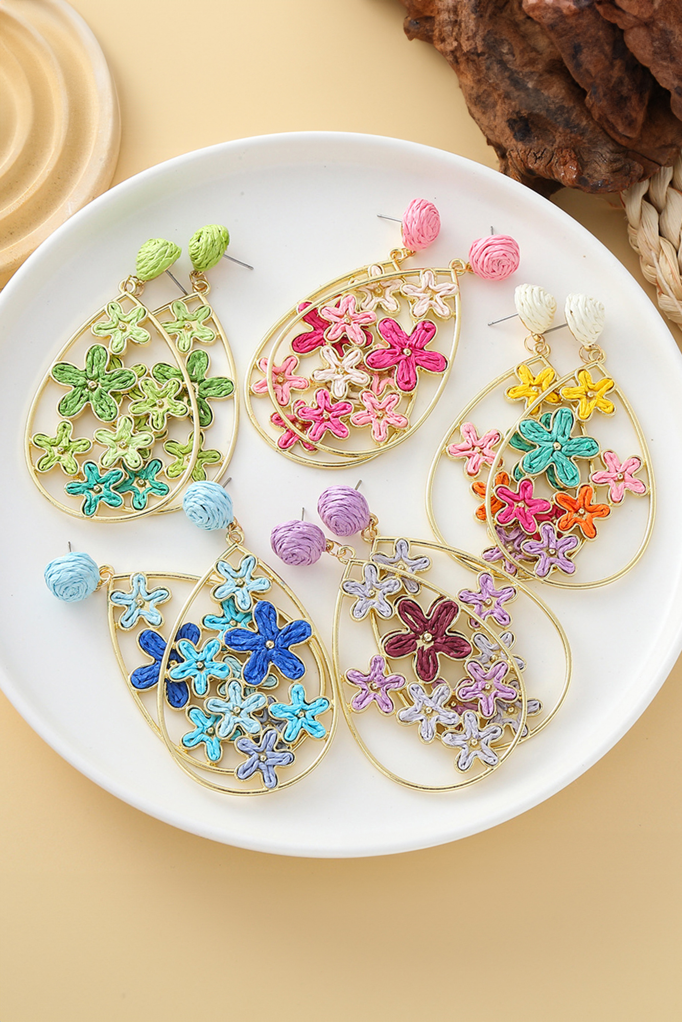 From coffee runs to casual nights out, Marley Plaited Plated Waterdrop Earrings is ready for it all. Daring water drop earrings for women. Gold plated alloy and rattan detail design. It has stainless studs and boho flower details. Great for spring and summer, whether partying or vacation. Material: 100%Alloy.