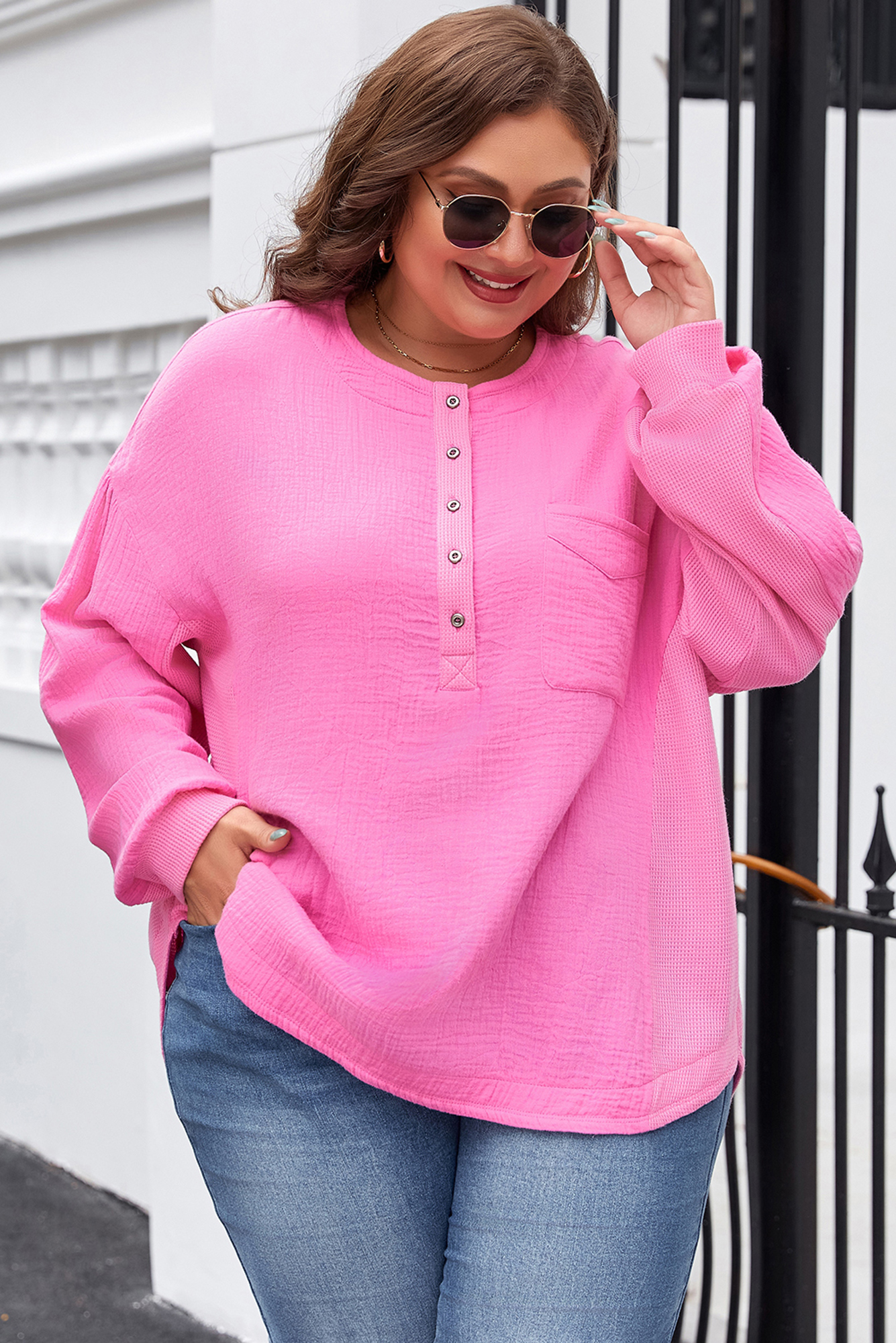 Let Mavis Chest Drop Sleeve PLUS Top do the work for you on days you want instant style with zero fuss. A stylish half-button placket creates this plus size top a unique and elegant look. A practical chest pocket adds a utilitarian element to this fashionable top. Relaxed drop sleeves offer an oversized, comfortable fit. Designed to cater to plus size bodies, ensuring a comfortable and flattering wear. Material: 100%Cotton.
