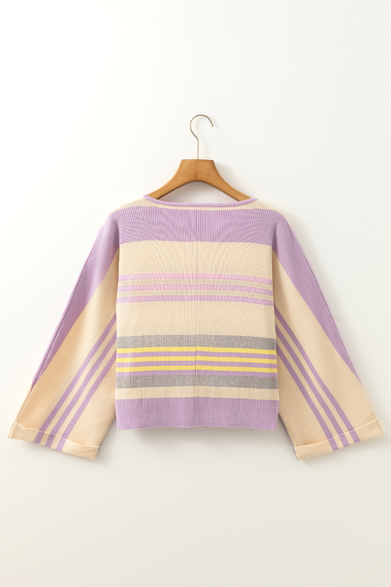 Meet Mia Cuffed Dolman Sleeve Sweater—effortless, flattering, and easy to style for everyday life. A trendy striped knitwear with a ribbed texture. Dolman sleeves with wide cuffs provide a relaxed and trendy silhouette. Rounded neckline and a slightly cropped cut for a casual vibe. Perfectly pairs with high-waisted jeans or skirts for a laid-back, everyday look. It’s popular to sweaters for women from brand. Material: 50%Viscose+28%Polyester+22%Polyamide.