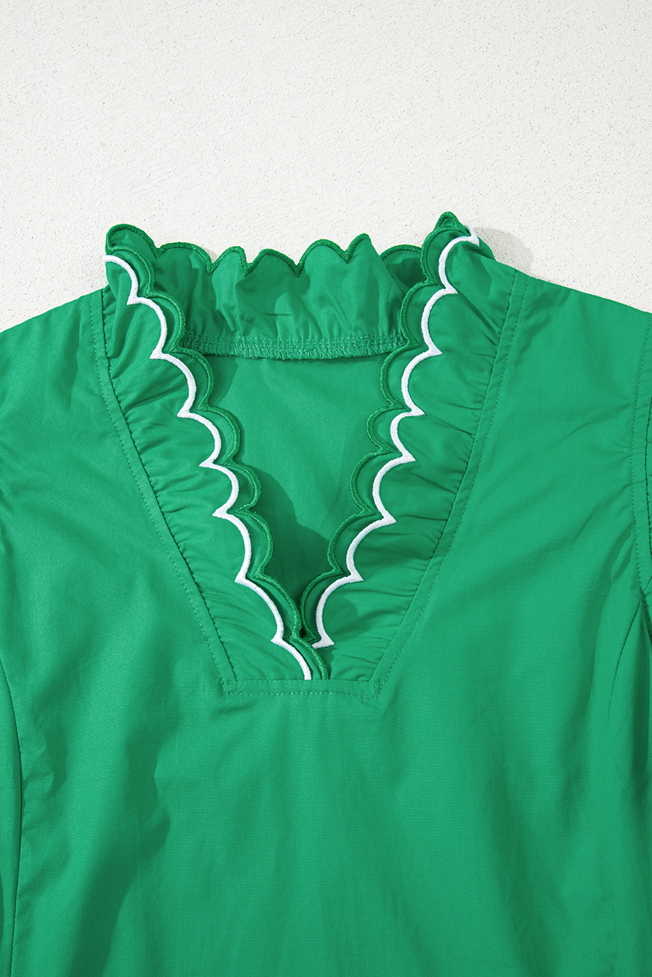 Say hello to Mia Layered Short Sleeve Blouse—effortless, everyday style with comfort built in. The layered v neck and ruffled short sleeves this blouse unique and feminine. It features scalloped detailing on the neck and sleeves. It’s loose fit for any body shapes. Lightweight and comfy for all day wearing. Material: 100%Cotton.
