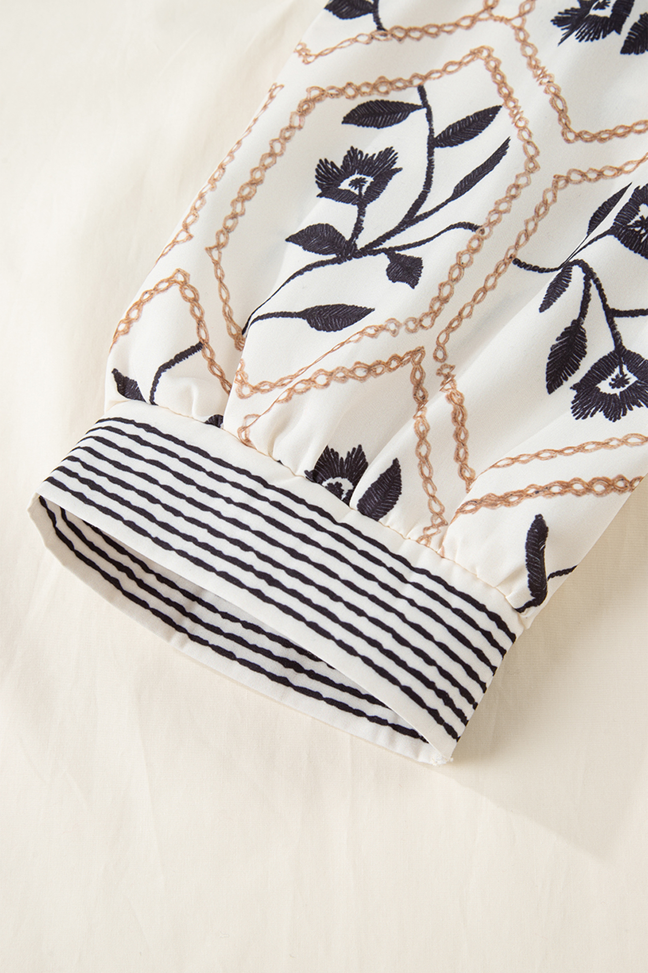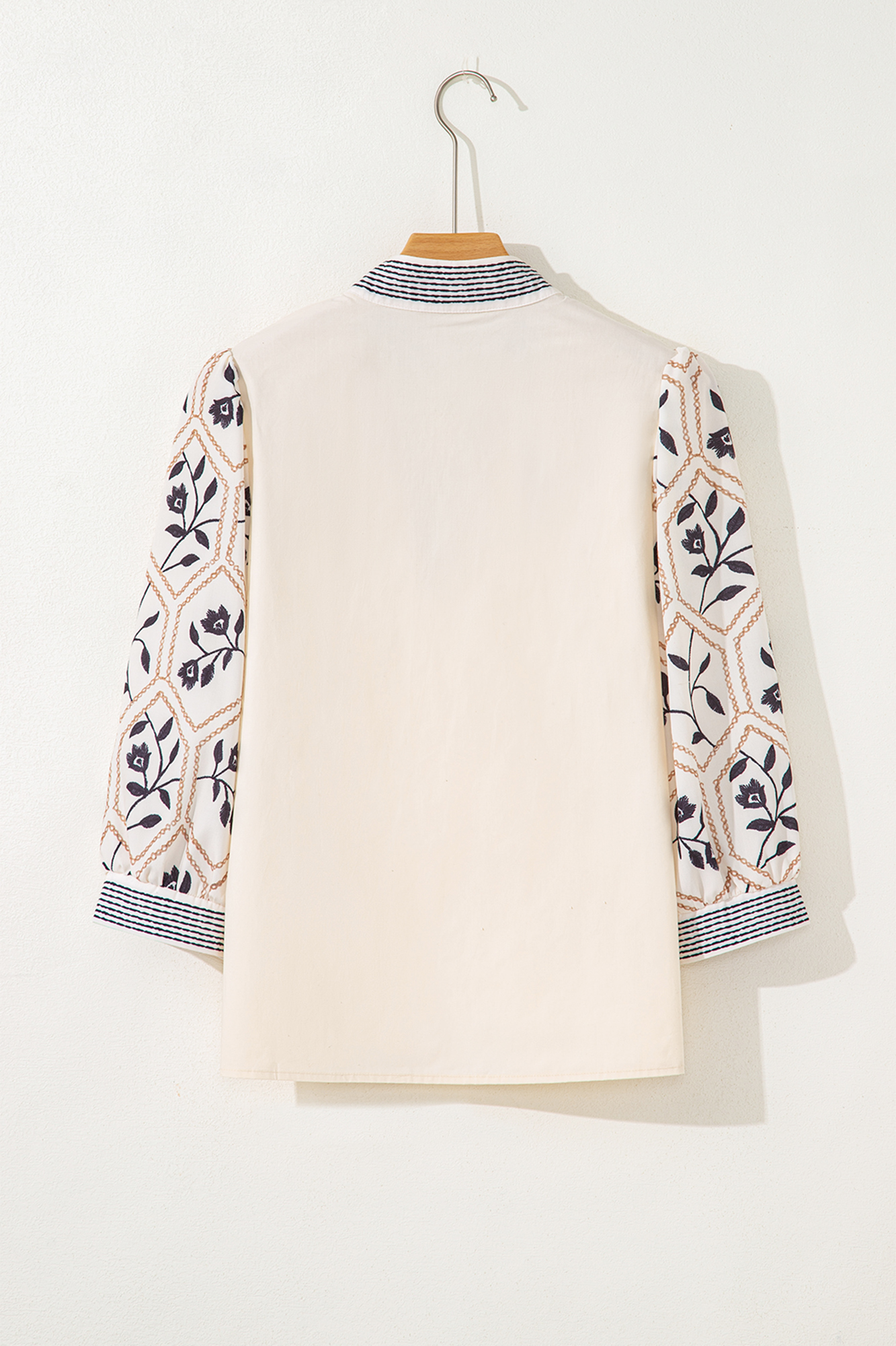 Pull on Micah Sleeve Contrast Patchwork Blouse for an instant outfit that feels laid-back but looks styled. Stylish floral patchwork blouse with a contrast V neck design. Puff sleeves create a feminine and elegant silhouette. Soft, breathable fabric offers comfort for daily or office wear. Perfect floral top to pair with jeans, skirts, or trousers. Material: 100%Cotton.