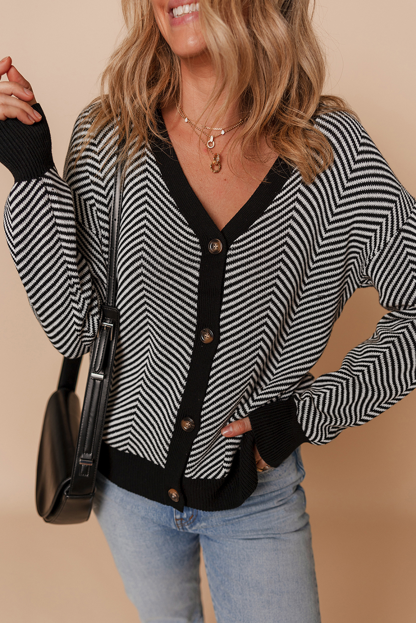 Nylah Stripe Front Herringbone Cardigan is the kind of piece you’ll wonder how you lived without. Classic herringbone knit adds timeless, elegant texture to any look. V neck design flatters your neckline and layers well over tops. Button front makes this cardigan easy to style open or closed. Soft, cozy fabric perfect for work, casual, or layering seasons. Material: 100%Cotton.