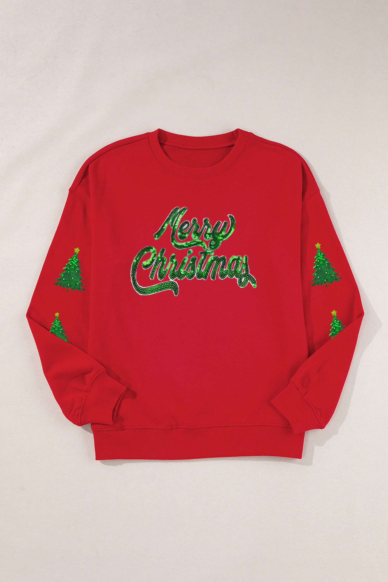 Throw on Ocean Patched Pattern Festive Sweatshirt when you need an easy outfit that still looks pulled together. Spread cheer with this playful sweatshirt. Featuring Merry lettering on the front. Drop shoulder design with sequin trees on both sleeves. Perfect for casual days and everyday fun throughout the season. Material: 50%Polyester+50%Cotton.