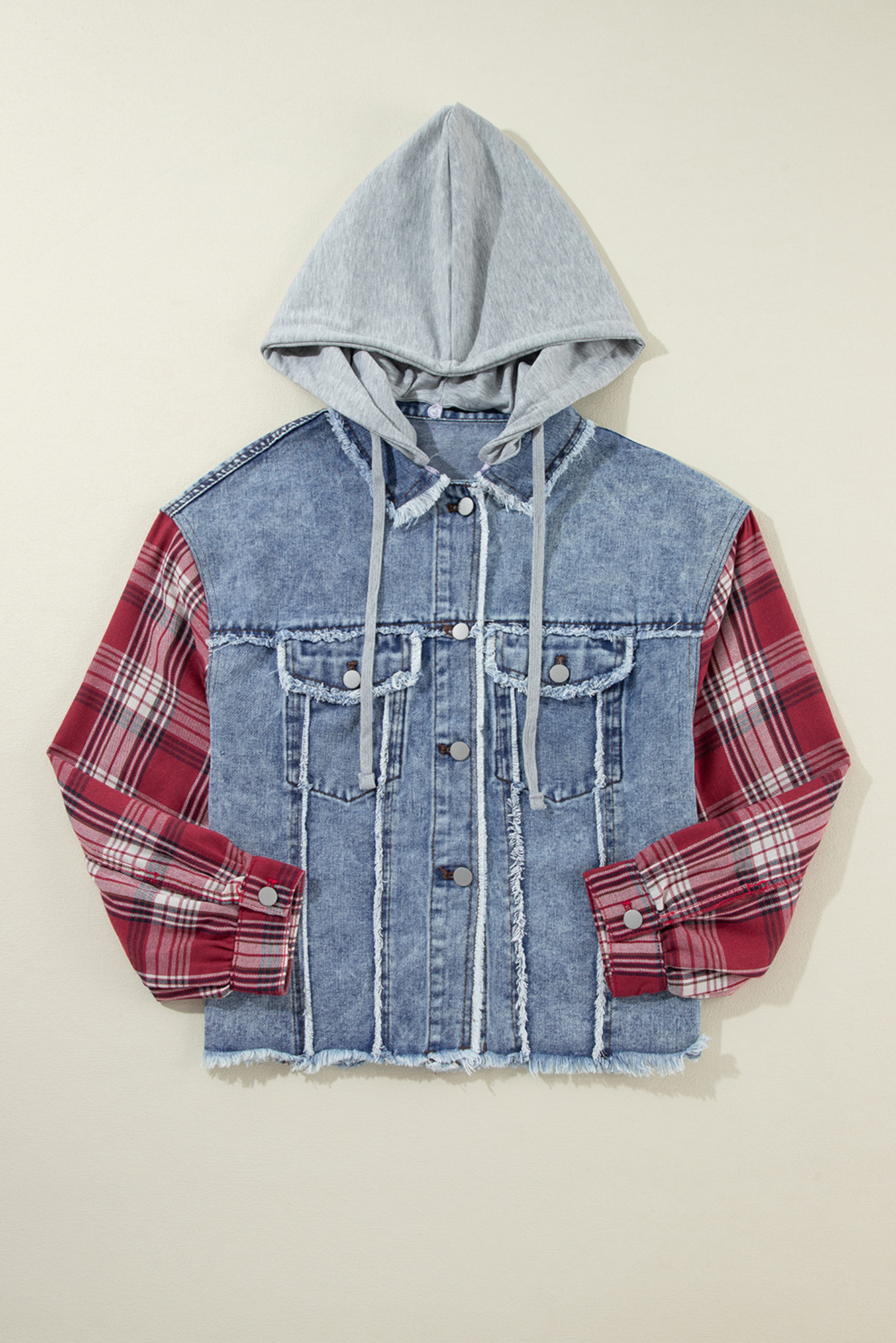 Meet Olivia Hooded Raw Hem Jacket—effortless, flattering, and easy to style for everyday life. Embrace a unique fashion statement with this hooded jacket. Elevate your casual style with a trendy plaid patchwork design. Achieve a vintage look with distressed hem details. Perfect for a laid-back day when paired with a t-shirt and jeans. Stand out with fashionable denim jackets . Material: 83%Cotton+17%Polyester.