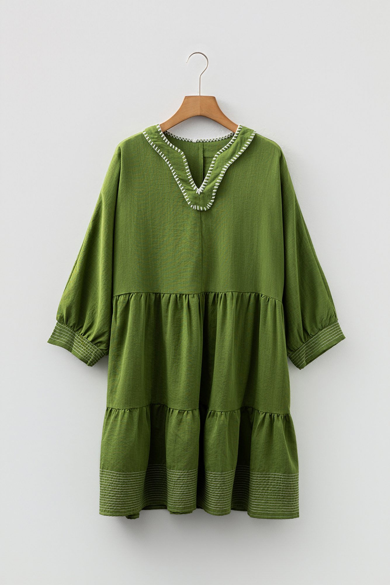 Meet Patara Sleeve Tiered Mini Dress—effortless, flattering, and easy to style for everyday life. This mini dress is popular with a chic and cute babydoll style design. The contrast stitched v neck adds elegant detail. Relaxed fit style with tiered design, 3/4 sleeves. The striped hemline makes this mini dress more classic and unique. Cheap mini dresses in bulk from Dear-Lover brand. Material: 46%Viscose+33%Polyester+21%Polyamide.