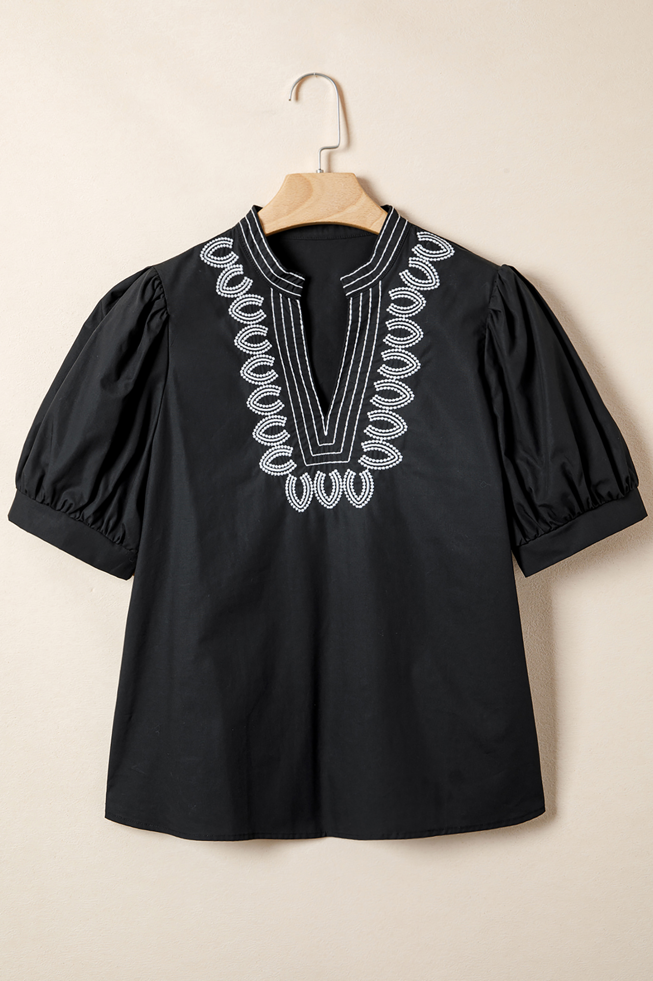 Raelynn Contrast Embroidered Detail Blouse is the piece you'll reach for when you want to look put together in seconds. Short puff sleeves add a playful, feminine touch. Contrast embroidery enhances visual appeal. V neck design flatters the neckline elegantly. This black blouse top is light to ensure all-day comfort. Material: 50%Cotton+50%Lyocell.