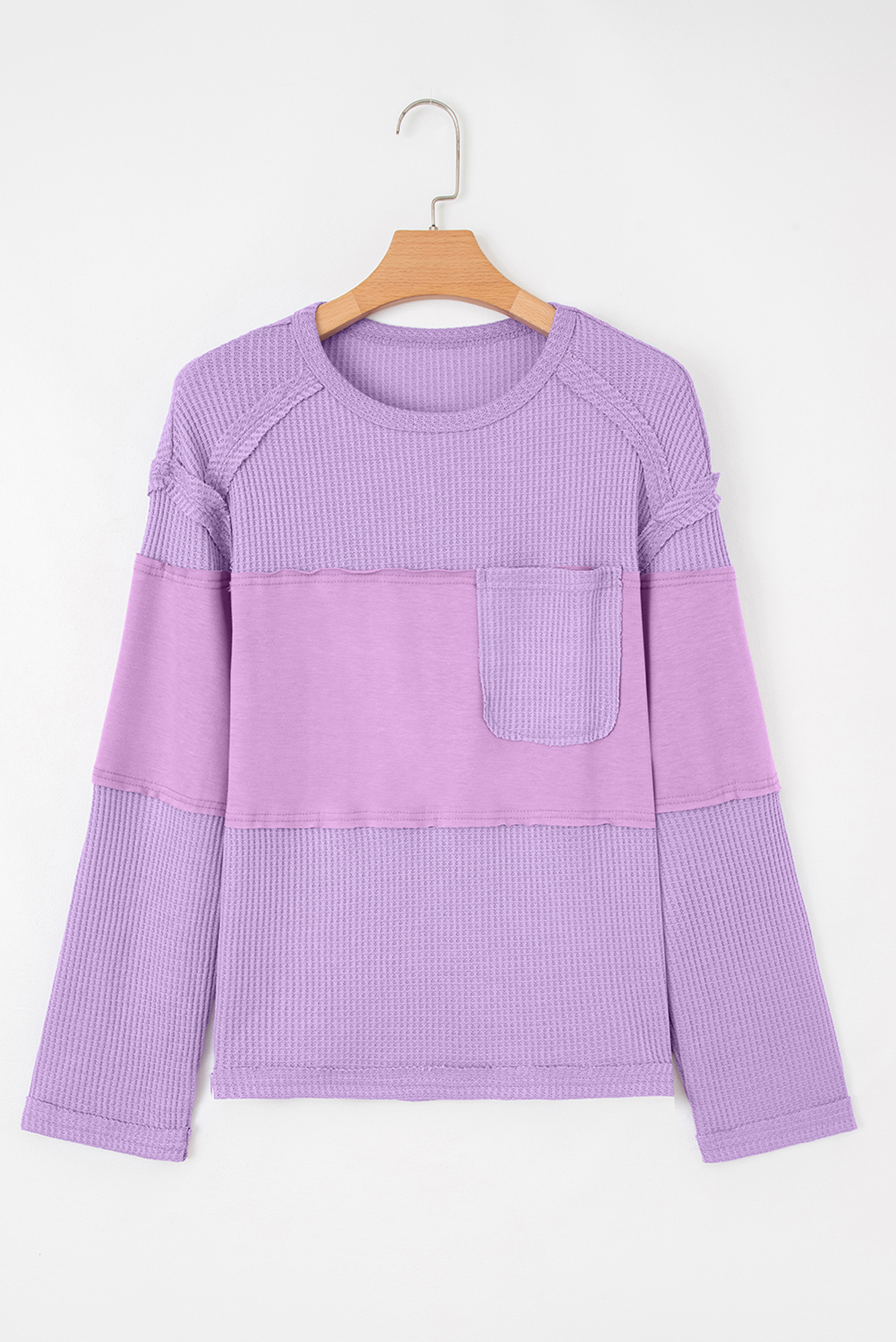 Meet Sawyer Contrast Textured Patchwork Long Sleeve Top—effortless, flattering, and easy to style for everyday life. This top will bring oversized comfort and style to your wardrobe. Features exposed seam details with waffle knit patchwork. It has a single chest pocket to add unique accents. A perfect long sleeve top for cool day in spring or fall. long sleeve tops are fashion essentials for all. Material: 100%Polyester.