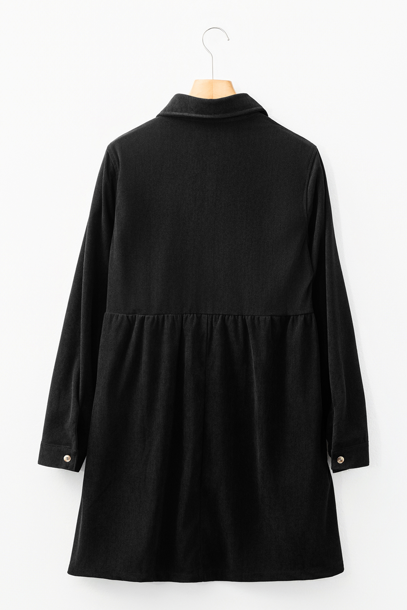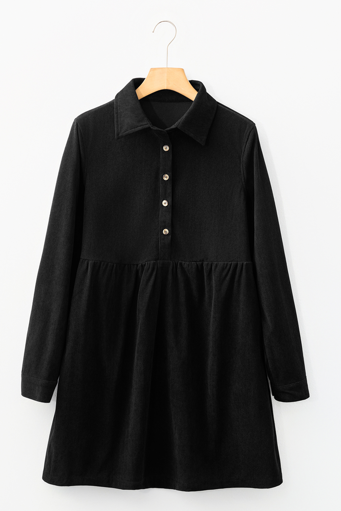 Meet Serena Long Sleeve Mini Dress—effortless, flattering, and easy to style for everyday life. Corduroy fabric adds vintage charm and cozy texture. Half button design with collared neckline offers a polished, timeless look. Long sleeves make this corduroy mini dress perfect for layering. Flattering A-line silhouette suits both casual and semi-formal occasions. mini dresses with sleeves for fall winter seasons. Material: 100%Polyester.