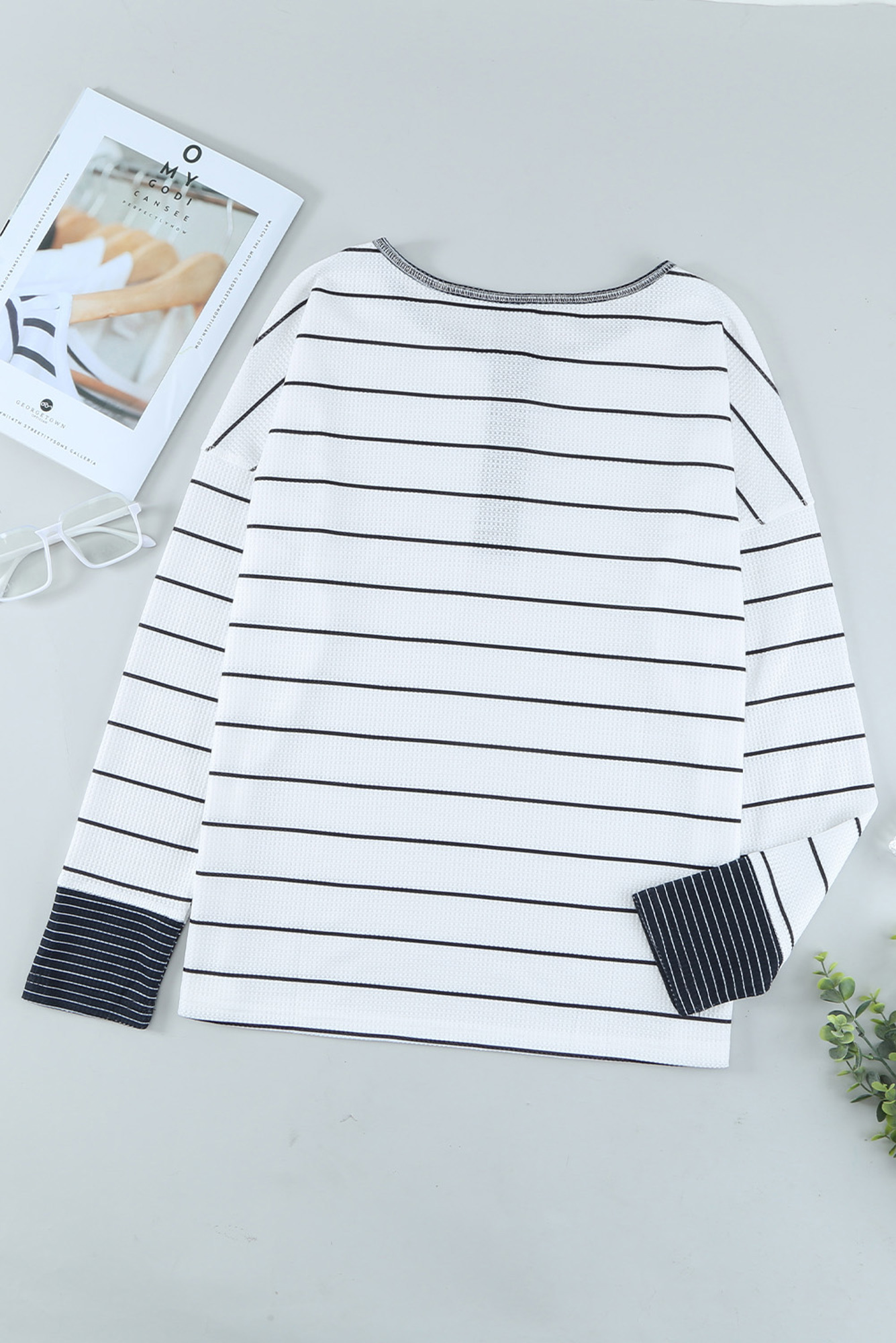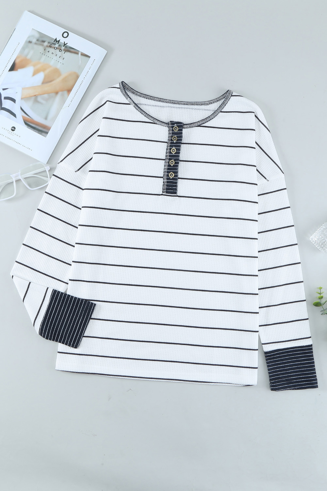 Meet Simone Henley Waffle Knit Top—effortless, flattering, and easy to style for everyday life. Striped and color block design makes the shirt more casual and stylish Waffle knit details makes the shirt more delicate and chicer With the buttoned design, the shirt is easy to wear on and take off Long sleeve top is easy to pair with jeans, sneakers, handbags for a trendy outfit shirts are suitable for home, office, date, school, vacation Material: 95%Polyester+5%Elastane.
