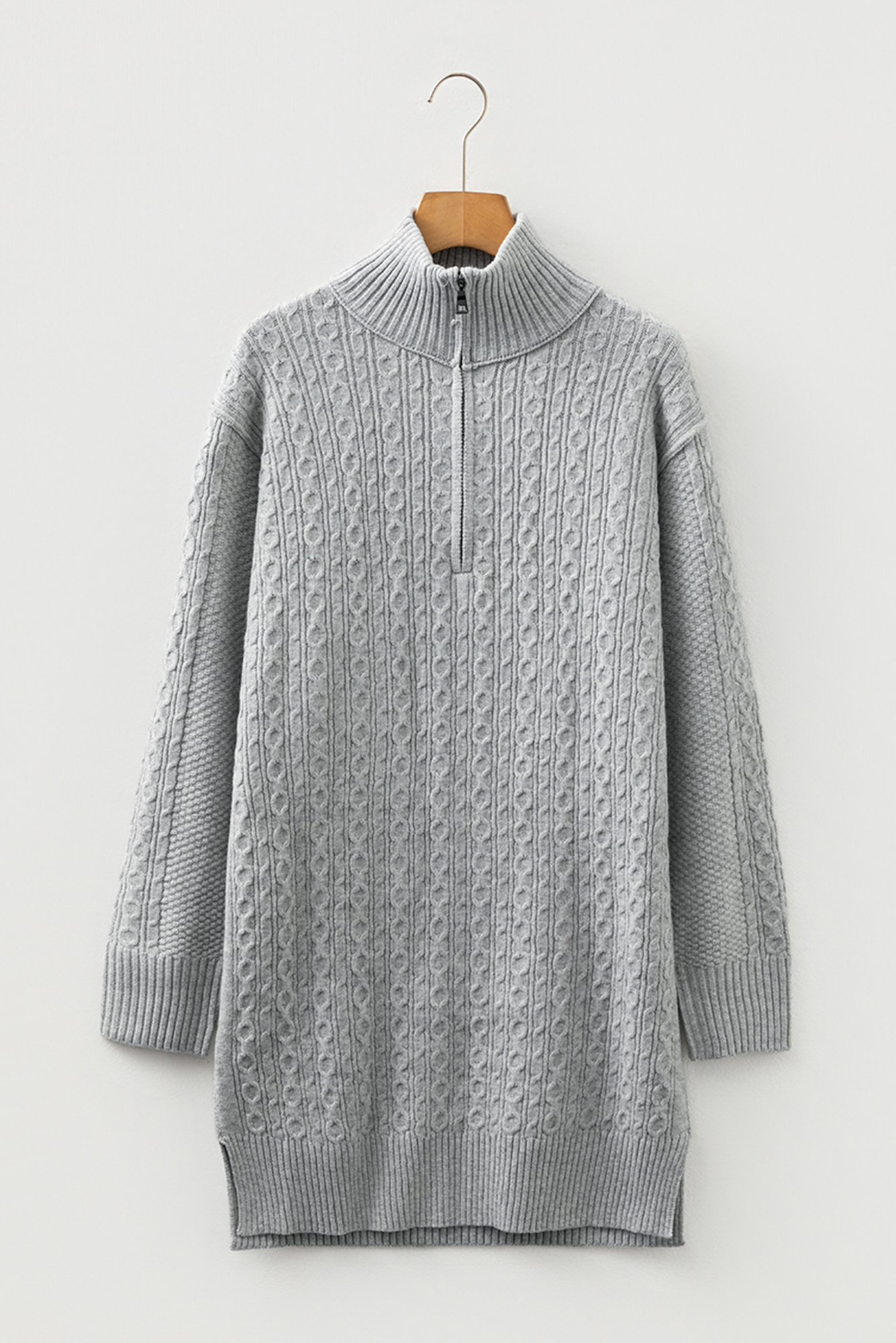 Meet Sofia Ribbed Trim Loose Sweater—effortless, flattering, and easy to style for everyday life. This sweater dress for women is classic with cable knit texture. The quarter zip collar design is elegant and convenient. Shift fit style with drop shoulder design, casual and relaxed. The ribbed edge gives a structured silhouette. sweater dresses with latest fall winter styles. Material: 70%Polyester+20%Acrylic+10%Polyamide.