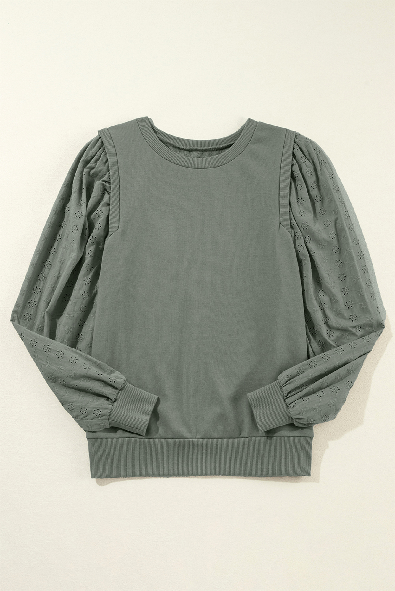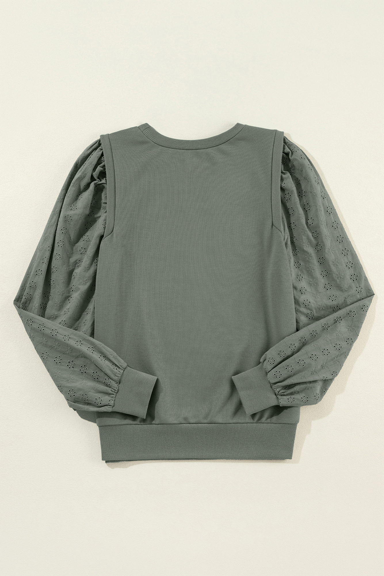 Dress in Valerie Solid Patchwork Sleeve Sweatshirt when you want a relaxed fit that still feels polished. Eyelet embroidered sleeves add a touch of elegance. Unique patchwork design for a trendy look. Round neck for a classic and versatile style. This pullover in solid color is easy to match. Material: 65%Polyester+35%Cotton.