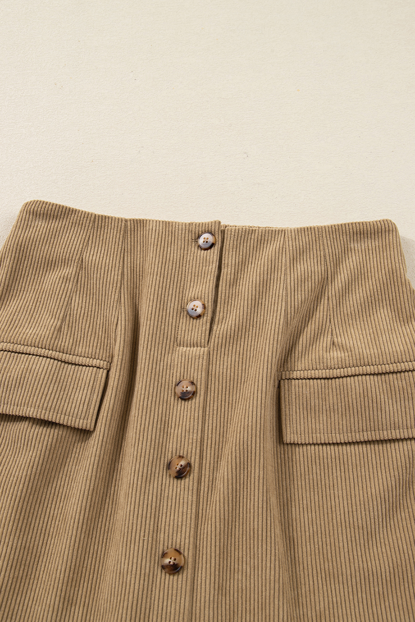 Meet Xiomara Front Faux Mini Skirt—effortless, flattering, and easy to style for everyday life. Classic corduroy fabric offers a vintage-inspired textured look. Buttoned front closure adds a chic, timeless detail. Faux pocket accents enhance a chic style. Mini skirt length is sexy and perfect for pairing with boots. skirts include corduroy styles for fall and winter options. Material: 100%Polyester.