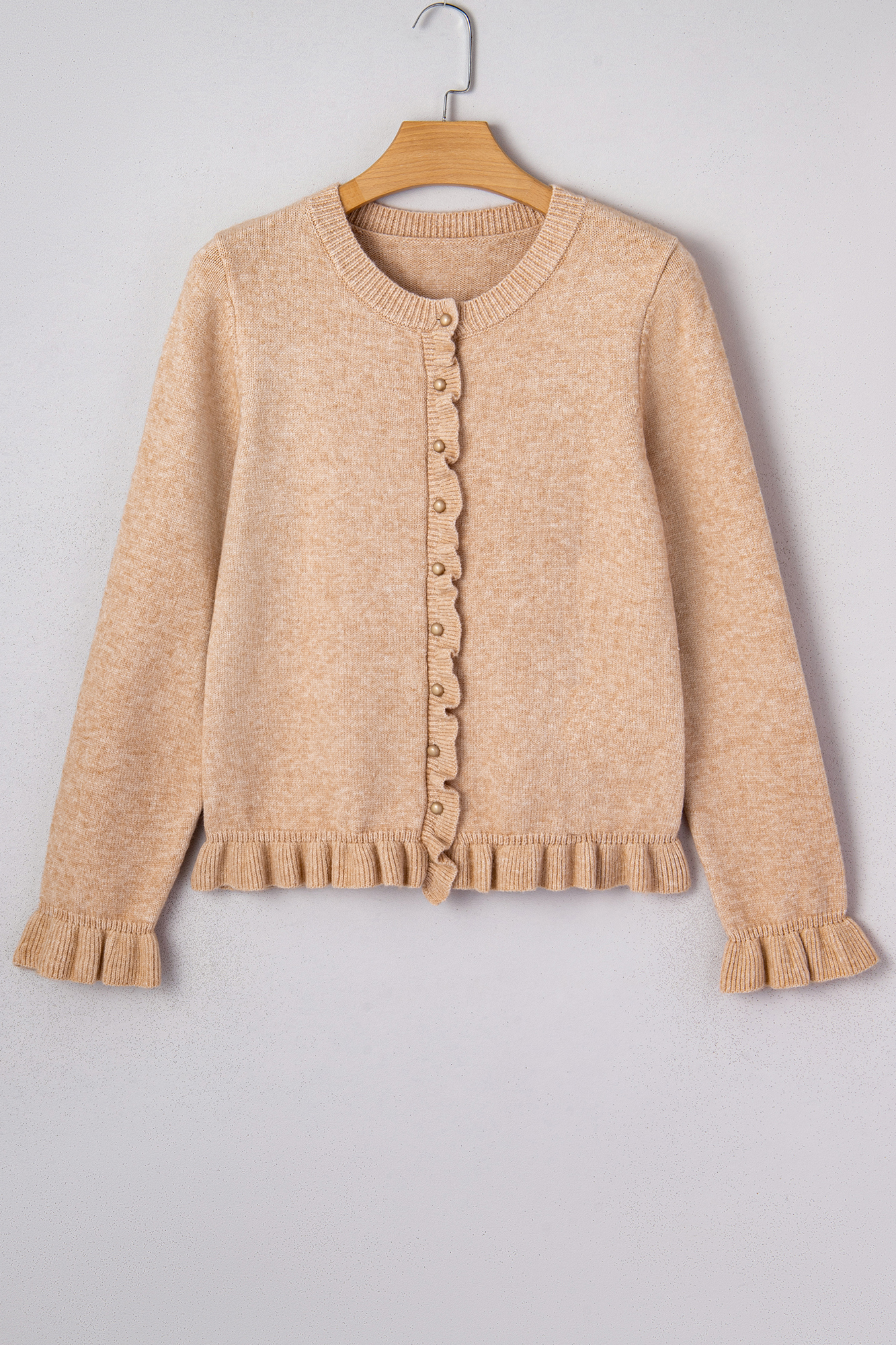 Yamileth Oatmeal Ruffle Trim Sweater is the piece you'll reach for when you want to look put together in seconds. Feminine ruffle cardigan design adds soft, elegant charm. Gold button cardigan create a polished, elevated look. Cozy knit fabric provides warm, lightweight comfort. Versatile style layers easily over tops, blouses, or dresses. Material: 30%Polyester+25%Viscose+25%Acrylic+20%Polyamide.