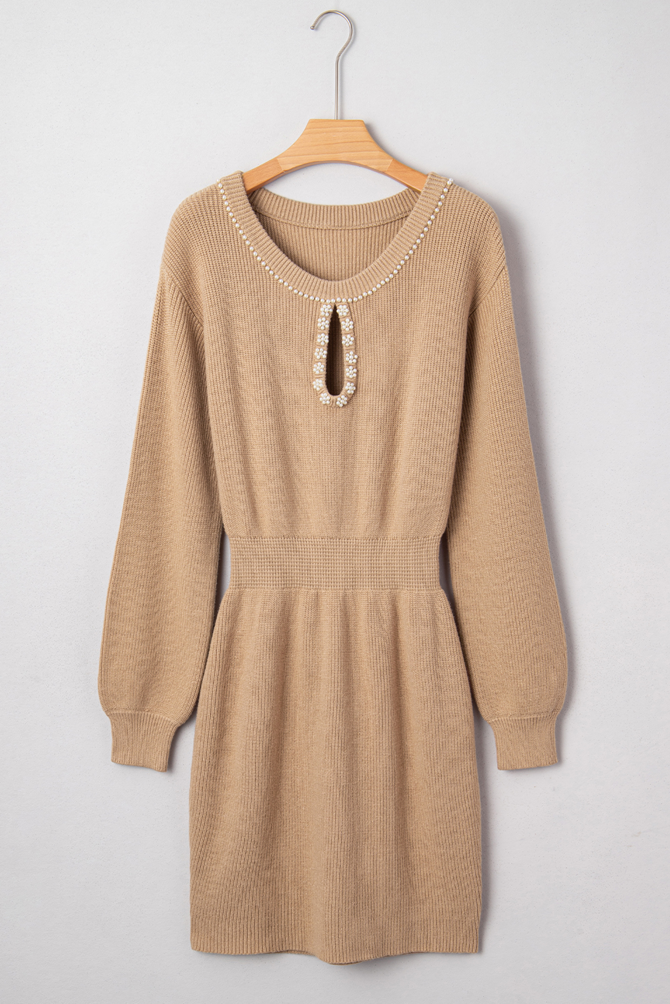 Throw on Zariah Embellished Keyhole Ribbed Sweater when you need an easy outfit that still looks pulled together. This chic sweater dress is sure to make you feel cozy up in elegance. The faux pearl-embellished design brings a pop of glam effortlessly on-trend. A round neckline with faux pearl embellishment and a keyhole accent on the front Long sleeves with ribbed cuffs, cinched waistline and it finished in a mini length hemline. Material: 52%Viscose+26%Polyester+22%Polyamide.
