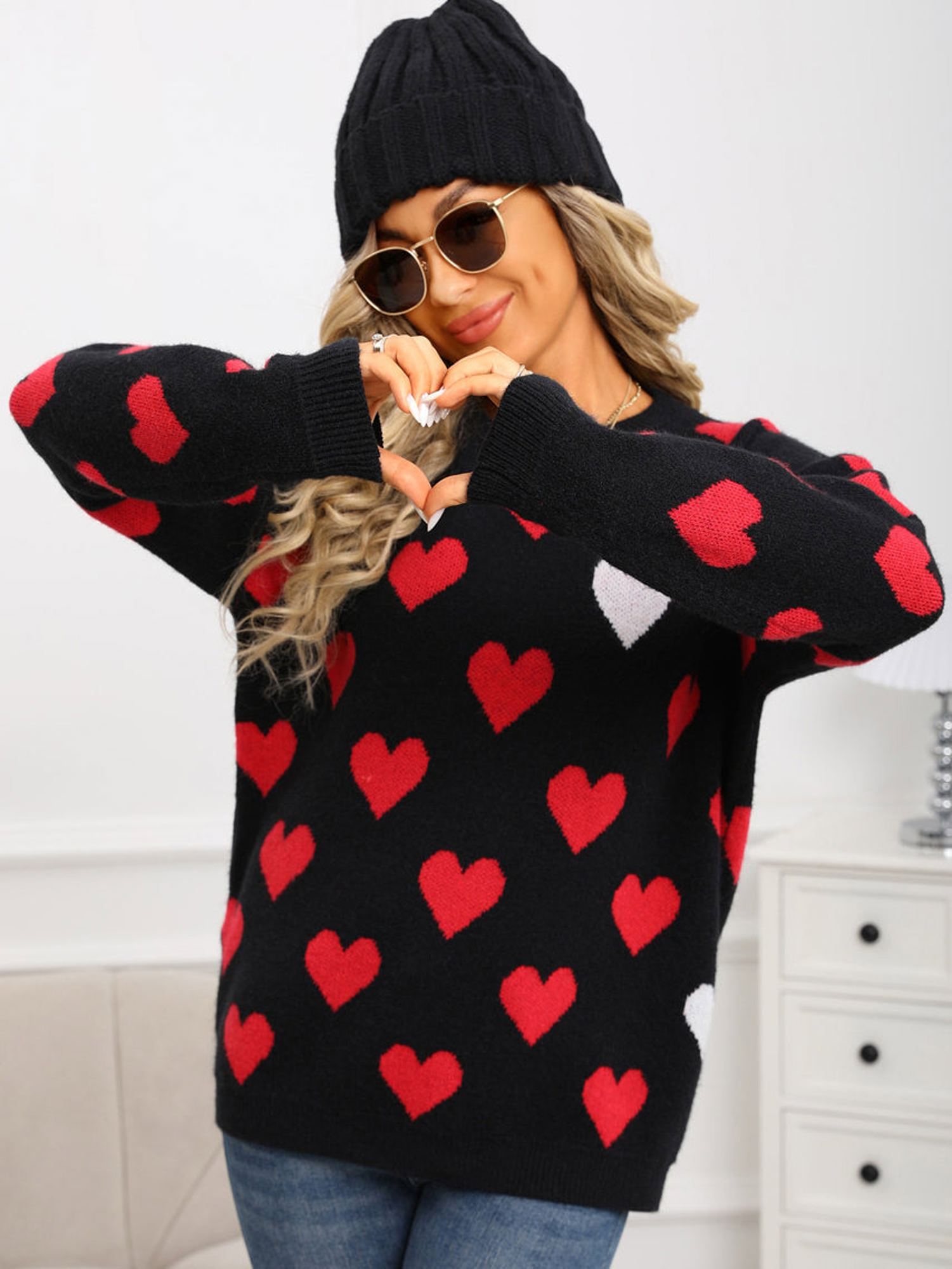 Add a bold pop of personality to your seasonal wardrobe with our Contrast Heart Print Sweater. Featuring eye-catching heart designs in a striking contrast color palette, this cozy knit blends playful charm with everyday wearability. The soft, comfortable fabric keeps you warm while the standout heart print makes this sweater a fun statement piece for fall and winter.