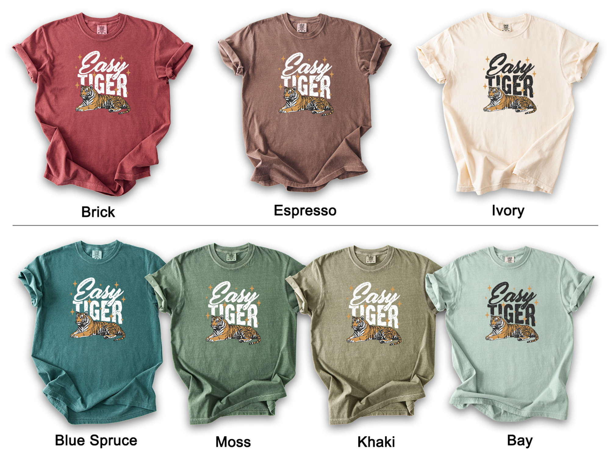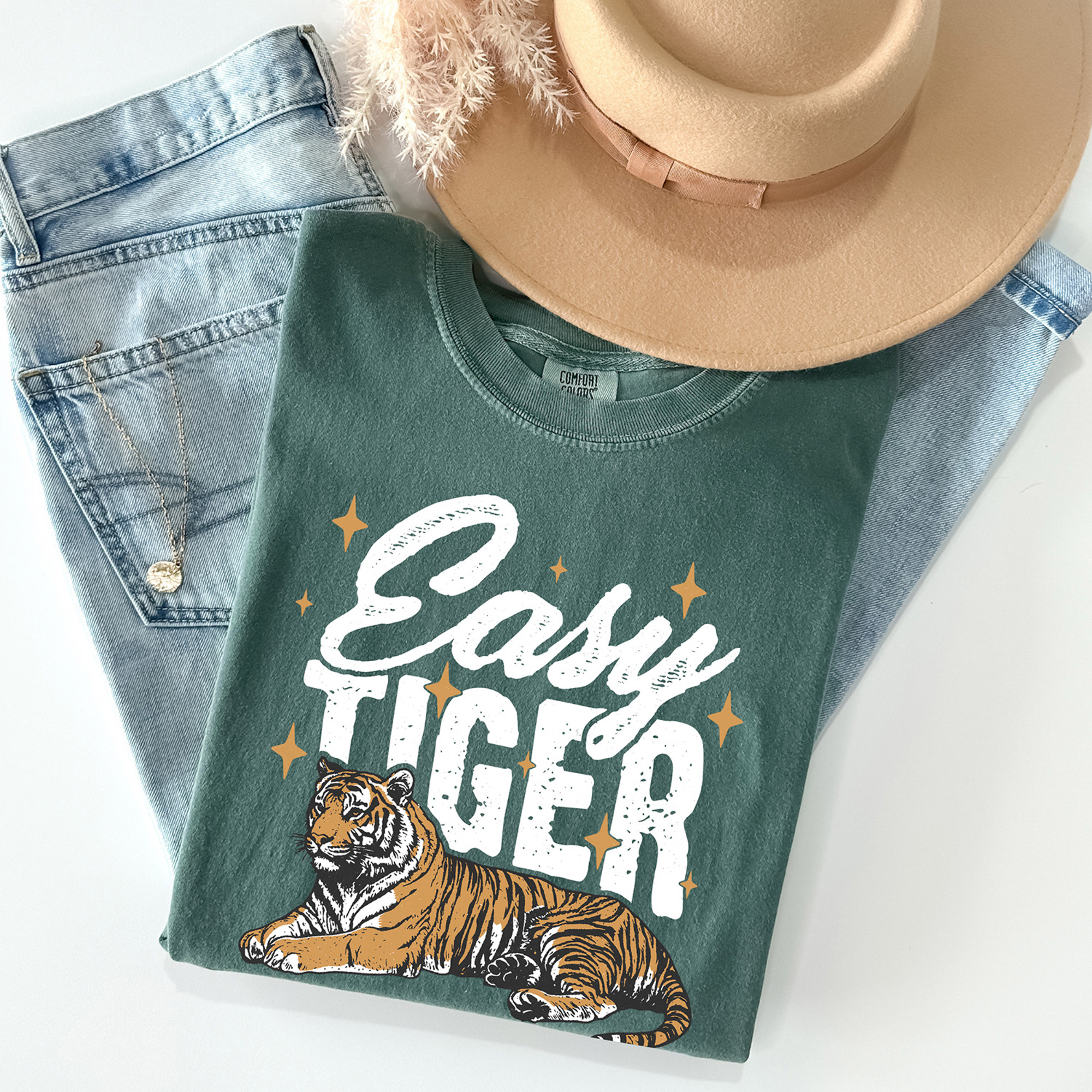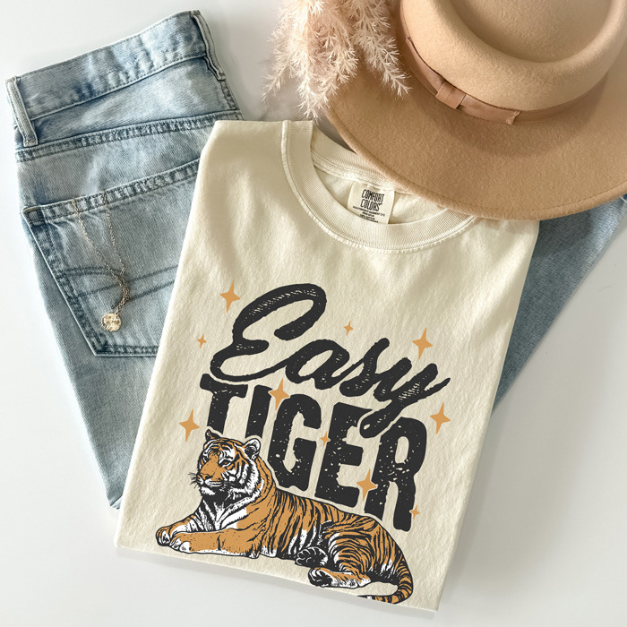 âž¼ Bold Tiger Design: The shirt showcases a fierce yet relaxed tiger graphic, paired with the playful "Easy Tiger" quote to keep things fun and easy-going.
