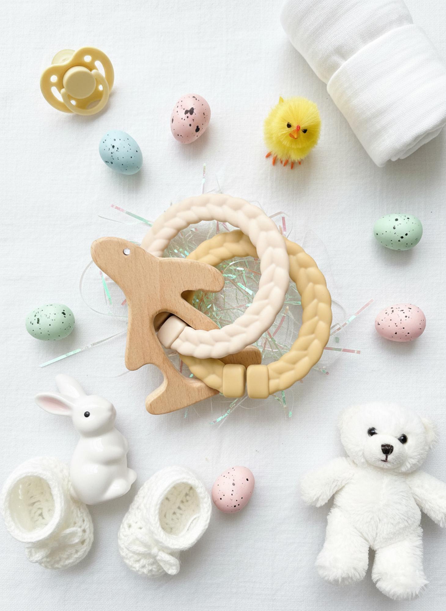 ** Rings are crafted from durable, food-safe polypropylene (PP) plastic. They are BPA‑free and phthalate‑free, and are also free of PVC, lead, cadmium, and other harmful chemicals. While they may look soft, they’re actually lightweight and hard, designed with a gentle braided texture that’s great for grasping and comforting sore gums. We love these rings because they are thoughtfully made with baby’s safety in mind. Not silicone — but still a safe and sensory-friendly option for everyday play.