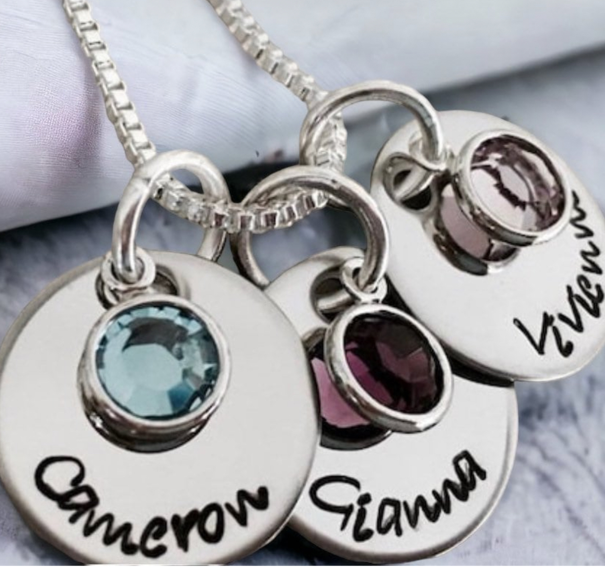 Each disc measures 5/8" in diameter, and can include one name and one birthstone. Comes with the upgraded box chain seen in the photo (normally an upgrade charge!) Charms are made from medical grade stainless steel, which will never rust or tarnish. Chain is .925 sterling silver and 20" in length.