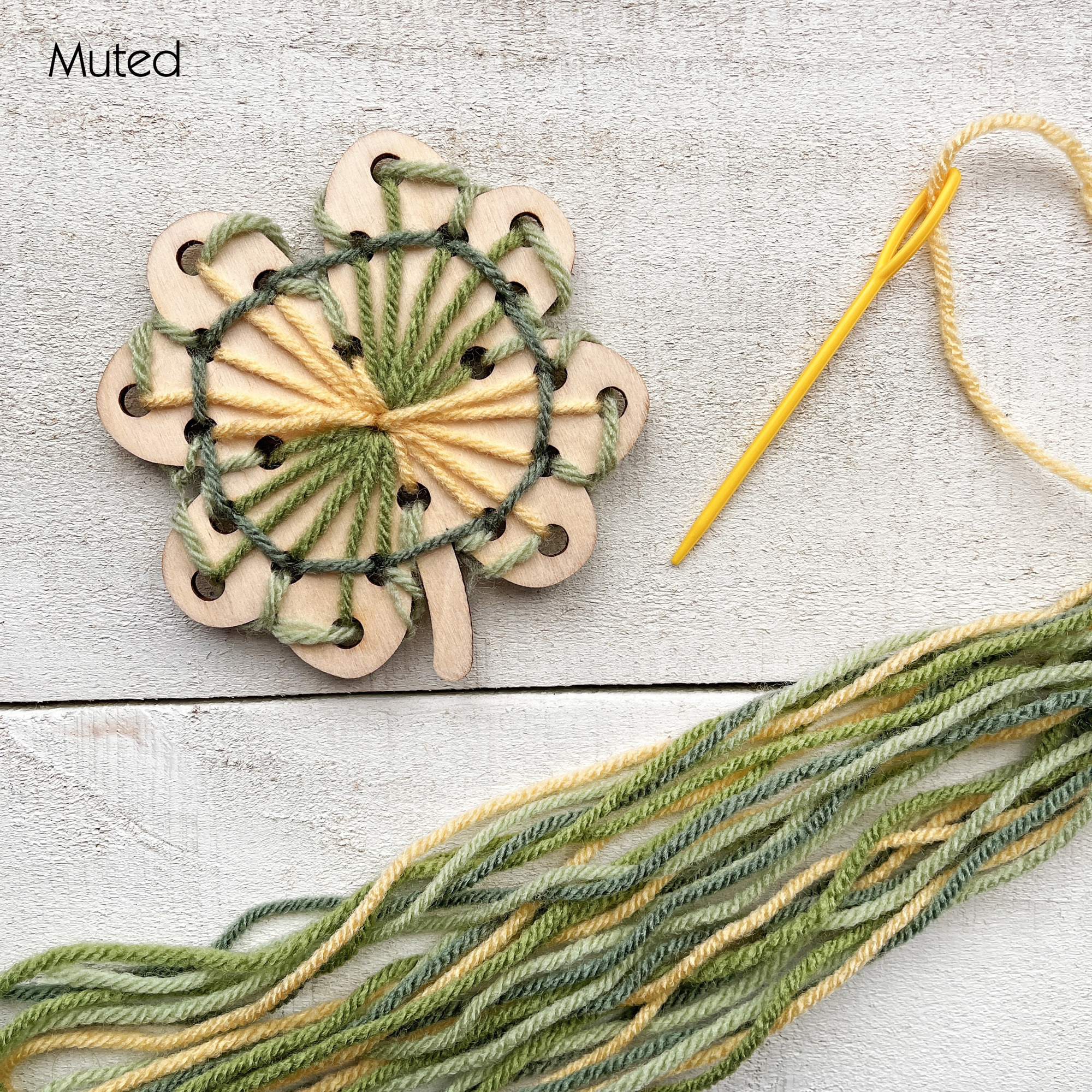 Each kit includes ONE shamrock, one plastic needle and four colors of yarn.