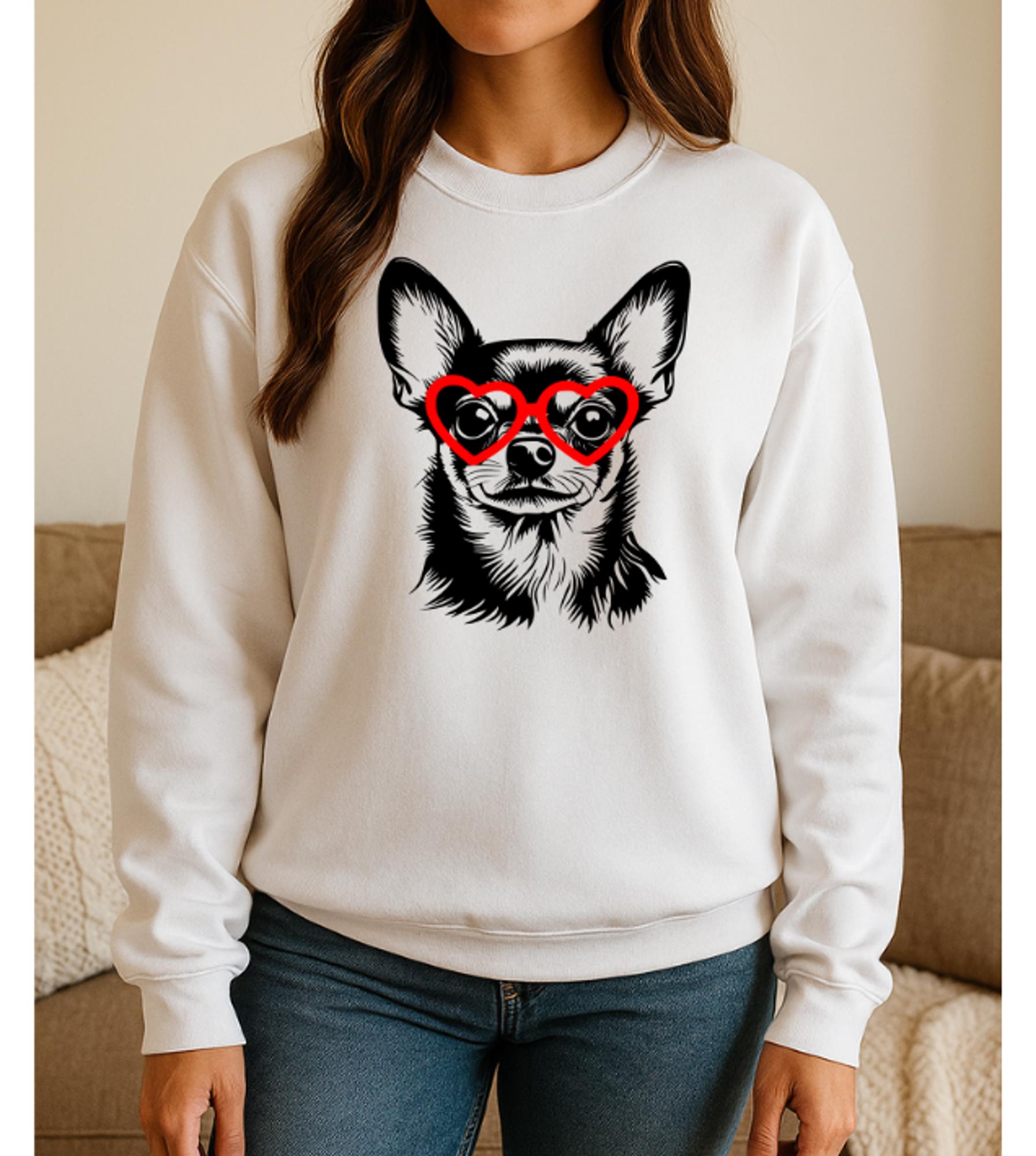 Our "Chihuahua Love" Graphic Sweatshirt is a delightful addition to any dog lover's wardrobe. Featuring an adorable Chihuahua sporting stylish heart-shaped glasses, this design is sure to capture hearts and spread joy. Printed on a high-quality Gildan sweatshirt, it offers comfort and durability, making it perfect for everyday wear. The playful graphic is both eye-catching and endearing, making it an ideal gift for Chihuahua enthusiasts or anyone who appreciates a touch of whimsy in their fashion choices. Whether you're lounging at home or out and about, this sweatshirt is a cozy way to showcase your love for these charming little companions.