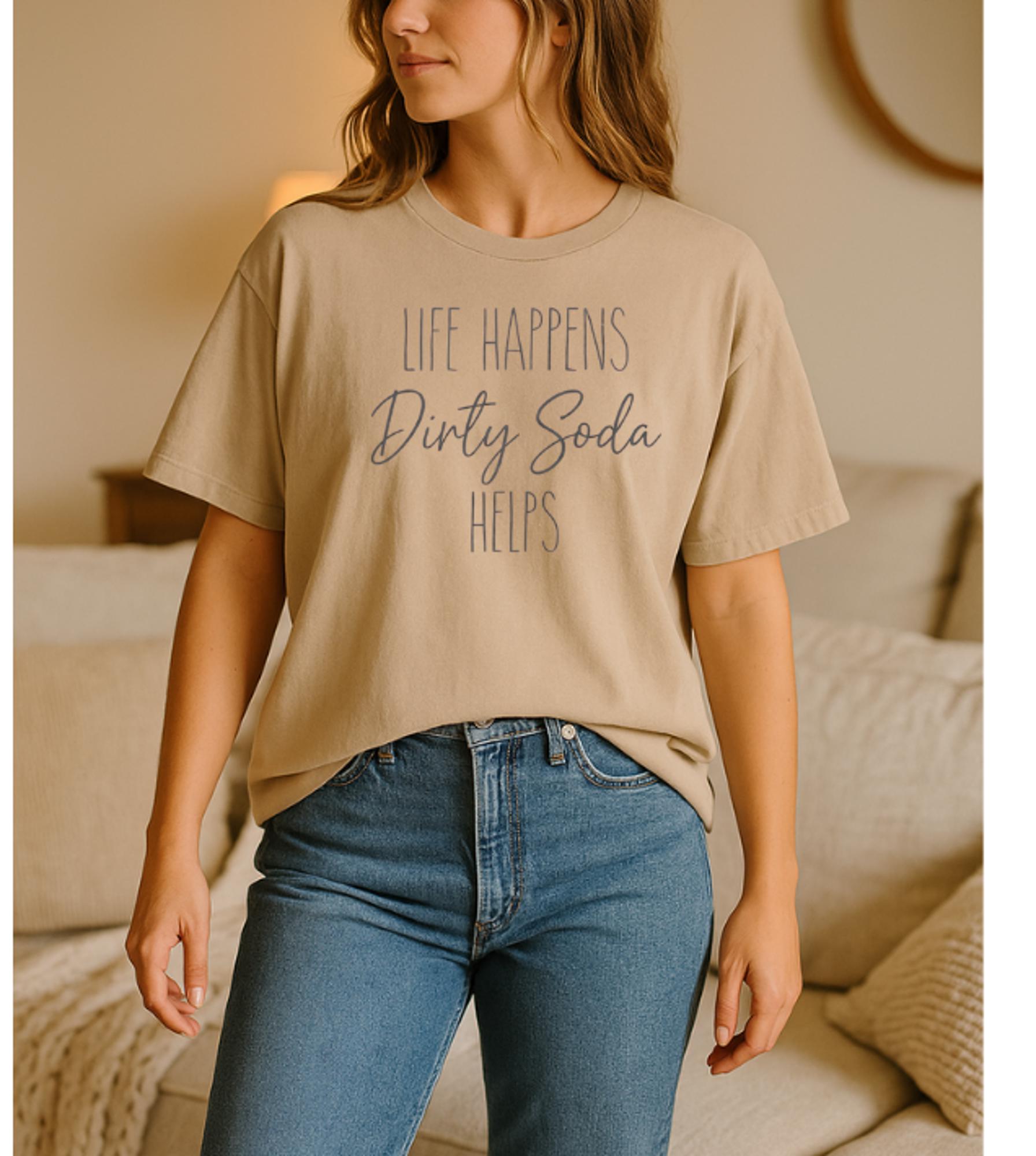 Life Happens Dirty Soda Helps Graphic Tee, Comfort Color Tee