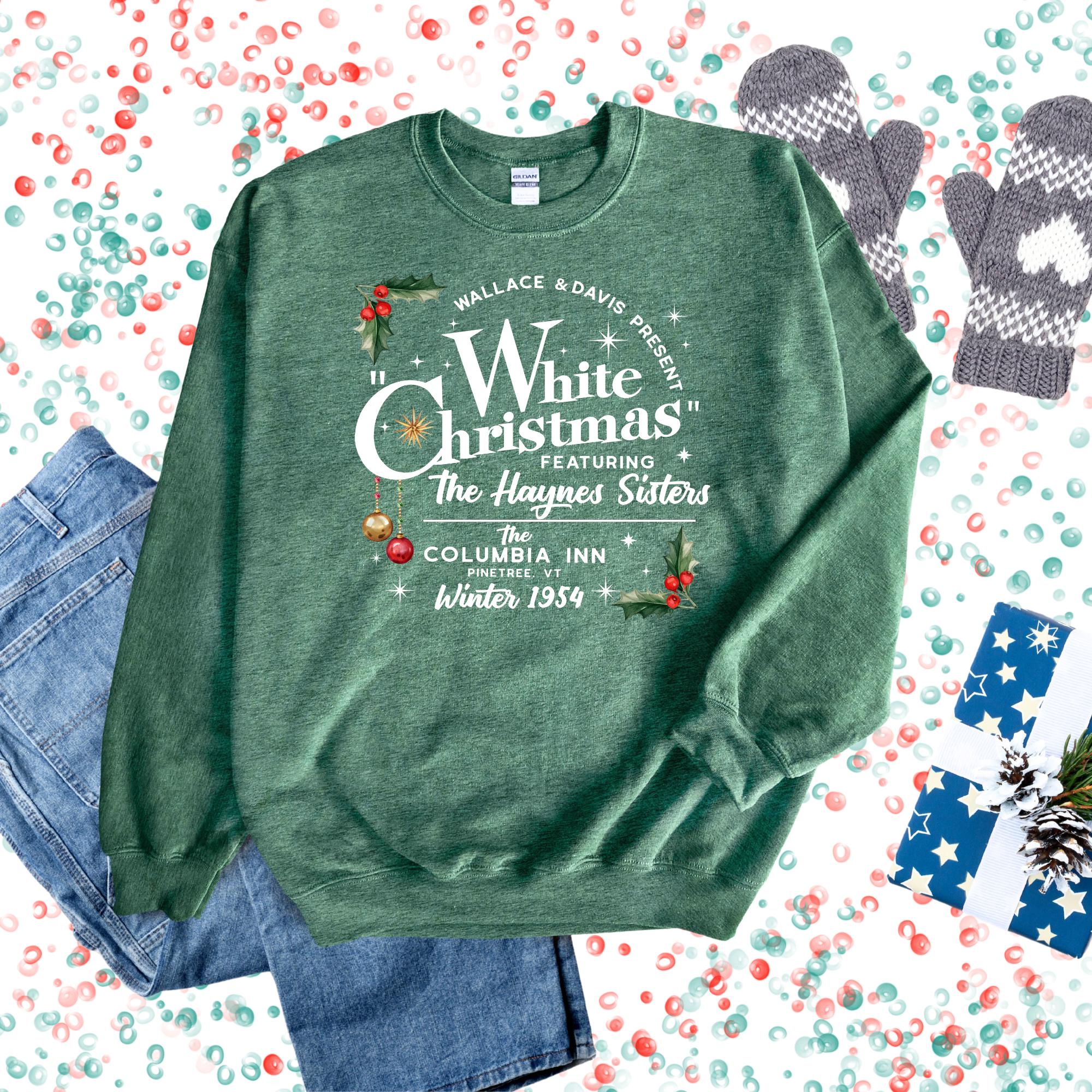 Step into the magic of the season with this White Christmas sweatshirt — inspired by the timeless classic that brings all the cozy holiday feels. Designed with a nostalgic 1950s flair, it features the charming “Wallace & Davis Present The Haynes Sisters” print, as if straight from the Columbia Inn stage in Pine Tree, Vermont.