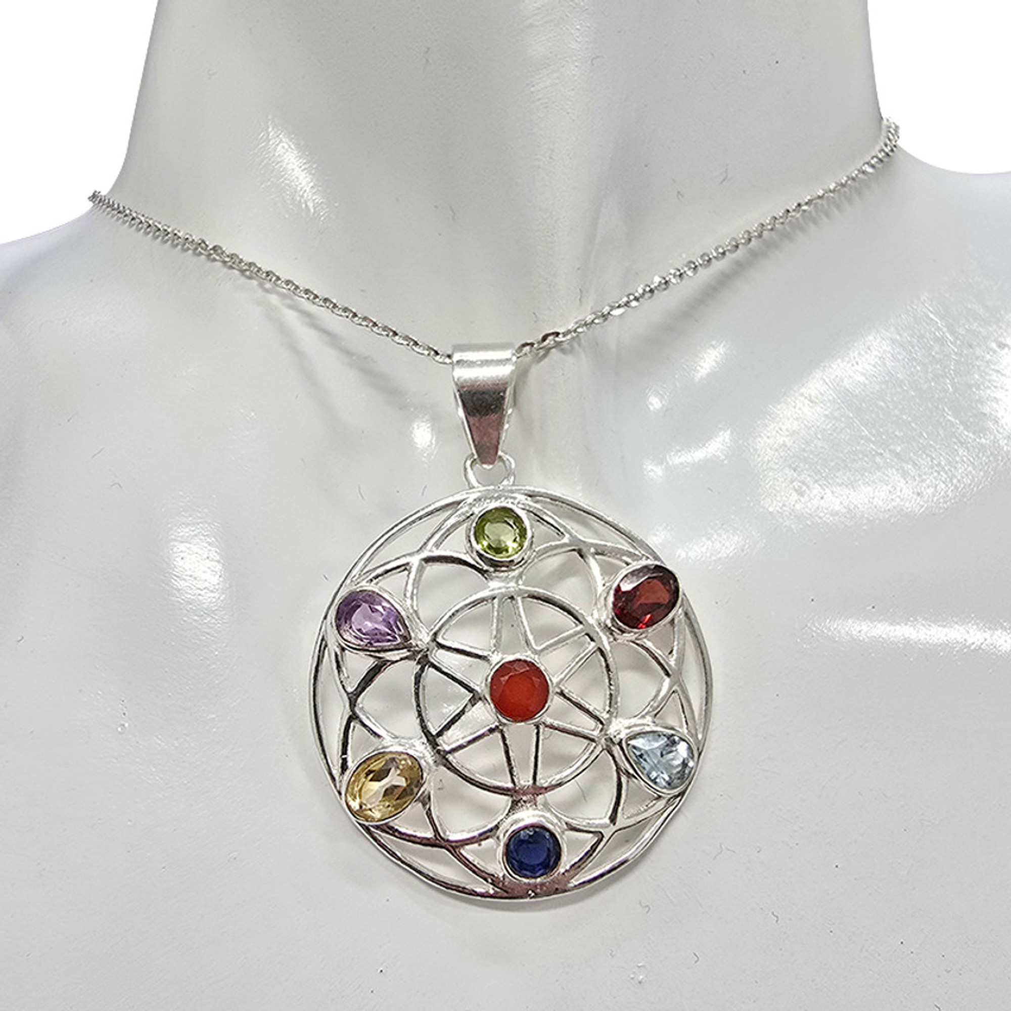 Faceted Multi-Gemstone 7 Chakra Mandala Pendant. Faceted citrine, peridot, blue topaz, garnet, red onyx and amethyst stones are set in .925 sterling silver.