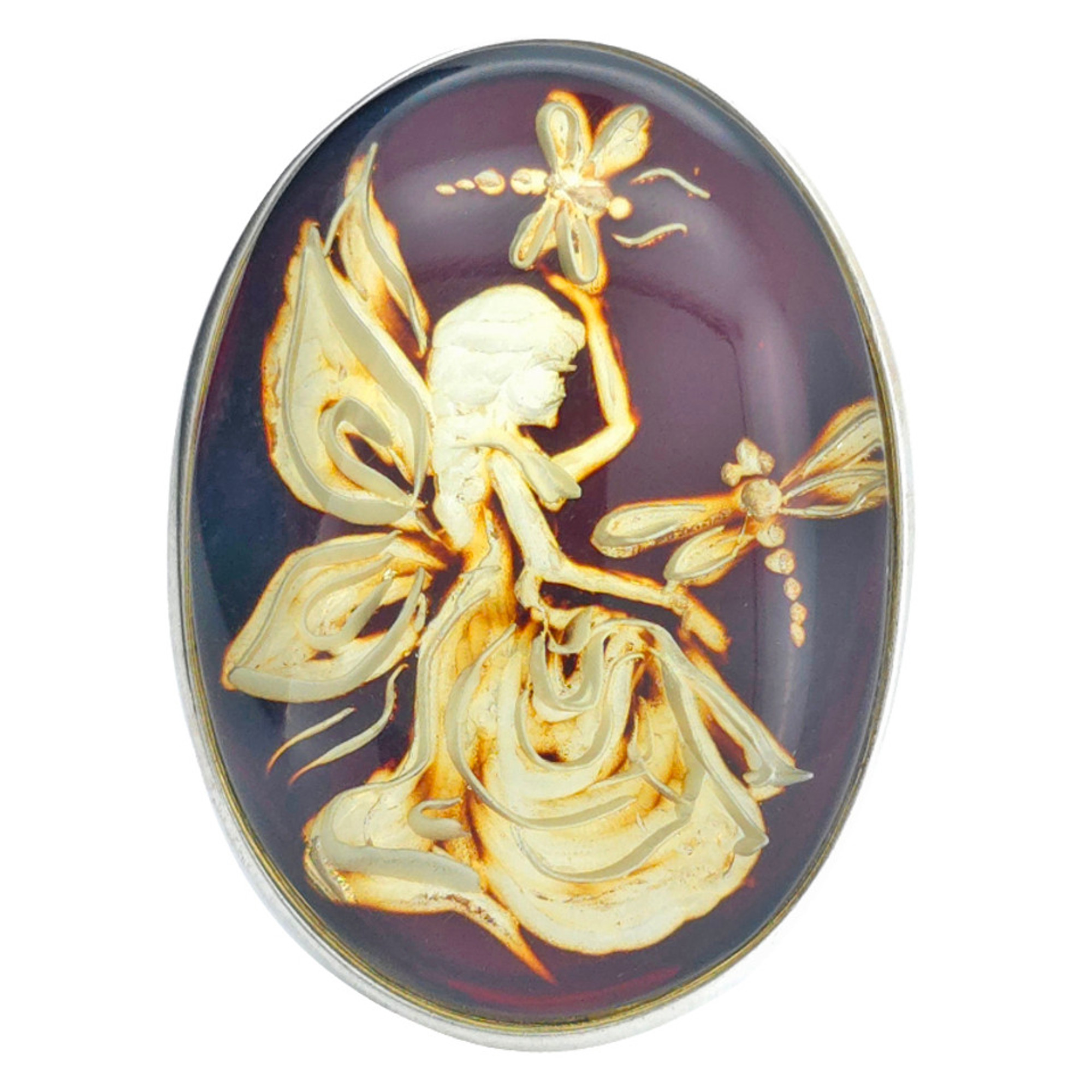 Fairy And Dragonflies Cameo Amber / Silver Adjustable Ring. Dark cognac amber stone with a carved image of a fairy with dragonflies is set in .925 sterling silver. Genuine Baltic amber ring. PLEASE NOTE: each piece is one of a kind, no two will
